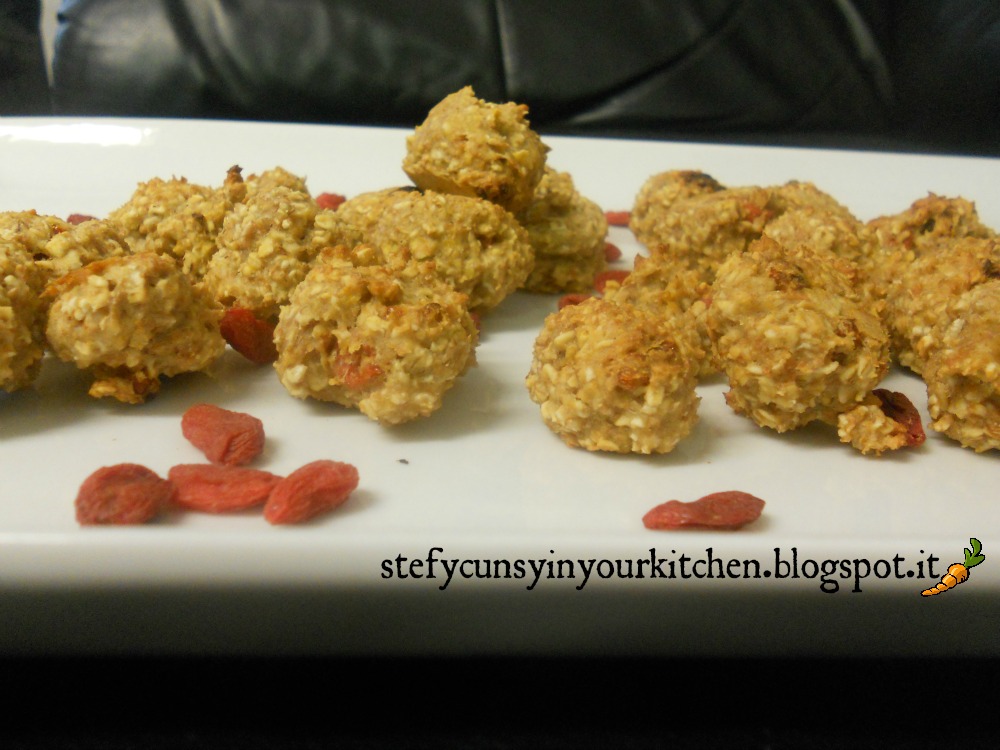 Le bacche di goji potete metterle sia nell’impasto, oppure meglio ancora, potete metterne semplicemente una sopra alla pallina che avrete formato, come si fa con le ciliegine 😉