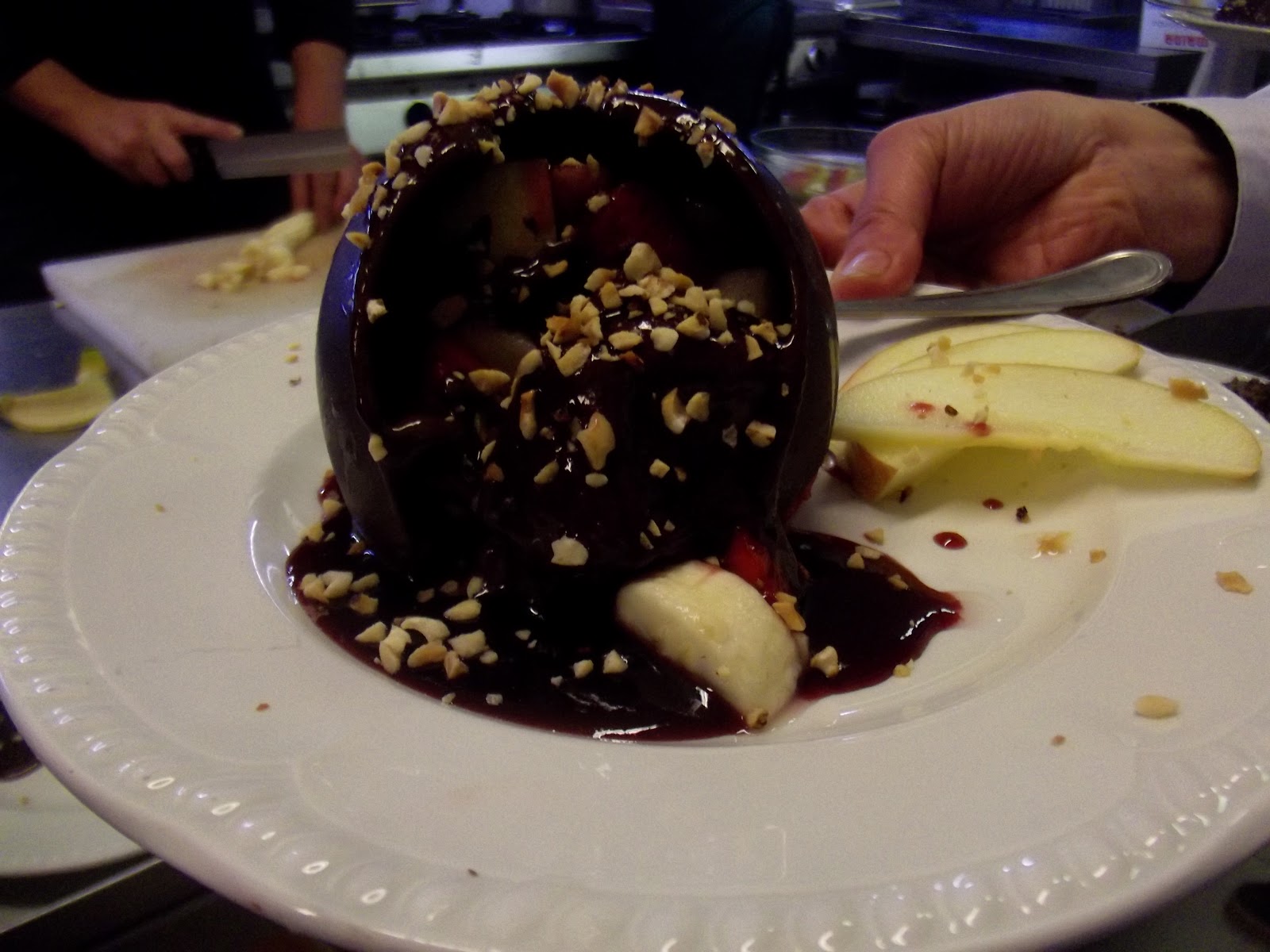 Tra le varie preparazioni del giorno precedente, Francesca e Gabriele si sono dilettati nella preparazione delle uova di Pasqua, rotte fondendosi con la coulis di lamponi bollente, a miscelarsi così con la macedonia di frutta fresca.