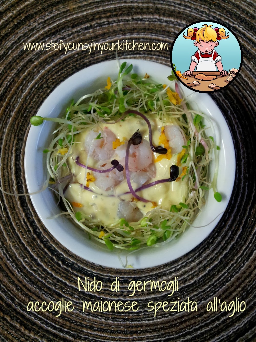 La settimana scorsa, visto che avevo le uova delle gallina di mia suocera, ho pensato di fare una maionese, di speziarla, servirla con dei gamberetti rosa e germogli misti.
