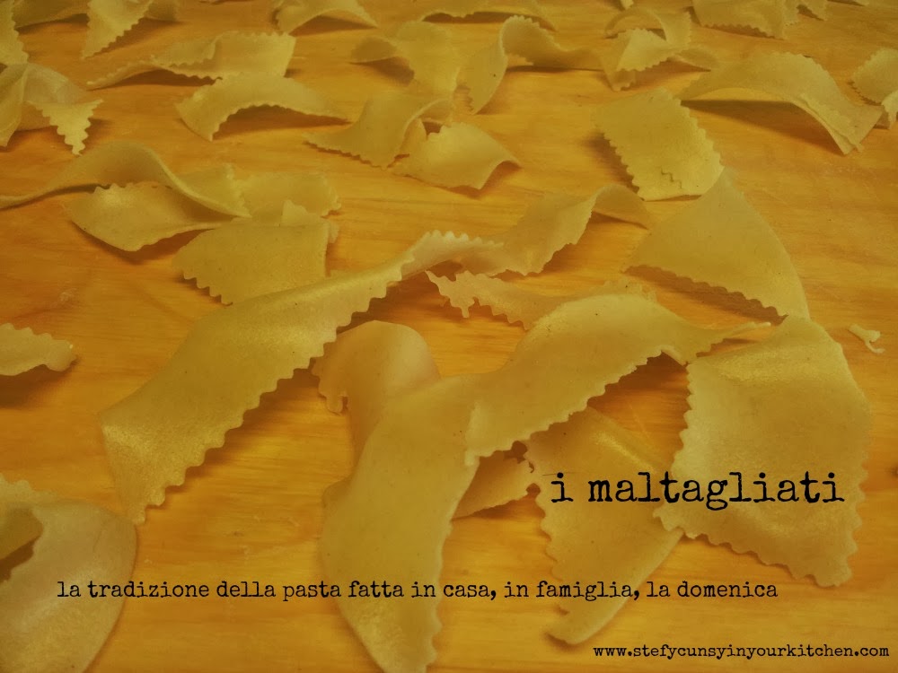 Sistemiamo la macchina per la pasta e stendiamo la sfoglia prima al numero 1 per un paio di passate, poi al 2, infine al numero 4. Otterremo una sfoglia stupendamente liscia, che taglieremo in rettangoli o triangoli irregolari con l’aiuto di una rotella da pasta e lasceremo asciugare i maltagliati sul tagliere per alcune ore. Quando saranno completamente seccati, possiamo cuocerli come una normalissima pasta e condirla a piacere.