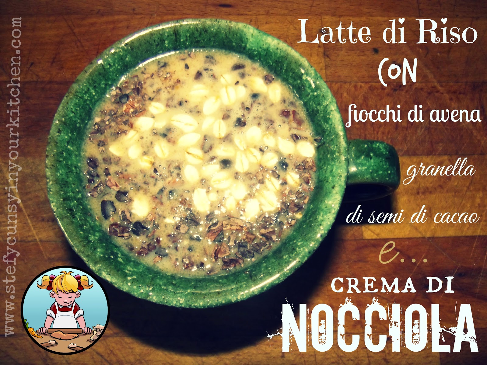 Ho messo un cucchiaino di crema nocciola che ho mescolato con il latte di riso freddo e poi ho unito i fiocchi di avena e la granella di semi di cacao.