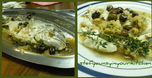 1 orata, olive nere, timo, olio extravergine di oliva, scalogno e a piacere del pan grattato precentemente condito con del prezzemolo, sale, olio extravergine ed un pò di brodo.