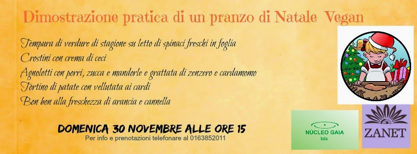“Ciao Stefania, faccio parte di una associazione olistica nata in Brasile da un gruppo di operatori Italiani, si chiama Nucleo Gaia. Da poco attivi in Italia, cerchiamo di sensibilizzare le persone ad uno stile di vita più armonioso, etico e consapevole con conferenze, corsi ed eventi, Con questi obiettivi Domenica 30 novembre abbiamo organizzato un evento a Prato Sesia presso GARDEN ZANET. Abbiamo attrezzato e messo in piedi una cucina vera e propria dentro una serra. Si tratta di cucinare un pranzo di natale vegano. e spiegare i motivi per i quali diventare vegani. Successivamente organizzare un corso vero e proprio di cucina vegana.”