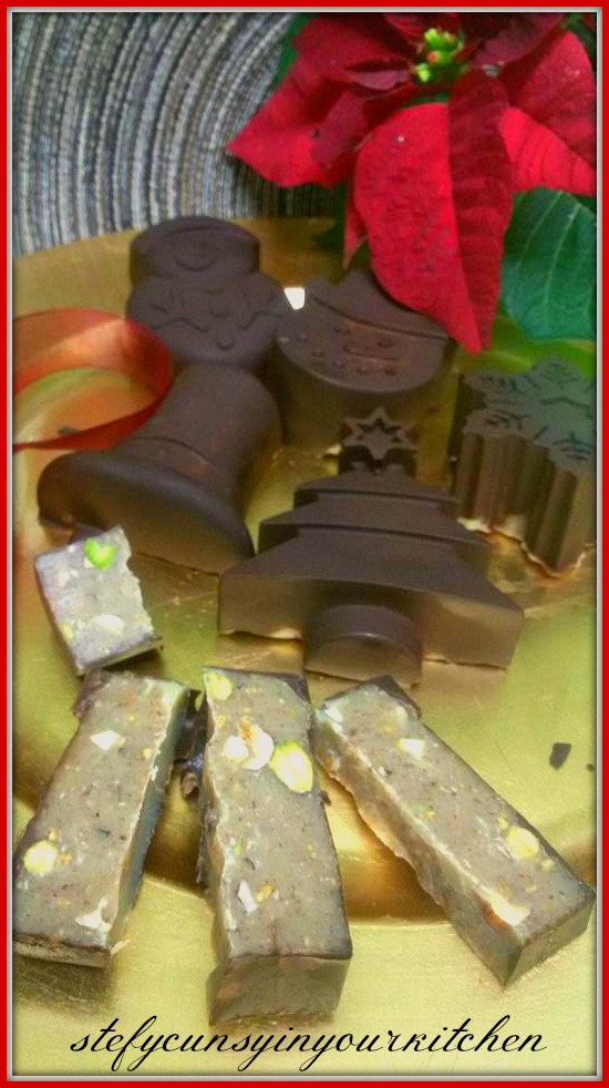 Ciò che vi occorre sono delle formine adatte per ottenere un torrone, oppure con degli stampi differenti, potete fare una sorta di cioccolatini ripieni da tagliare a pezzi, come vedrete nelle mie foto. Io mi sono sbizzarrita con delle formine natalizie e con quelle da gianduiotto, ma se non ne avete, potete utilizzare anche dei contenitori in plastica se ne avete in casa e successivamente farete i tagli. Io ho usato le forme in silicone, che adopero esclusivamente per le preparazioni “fredde”, cioè non uso il silicone per cuocere in forno.