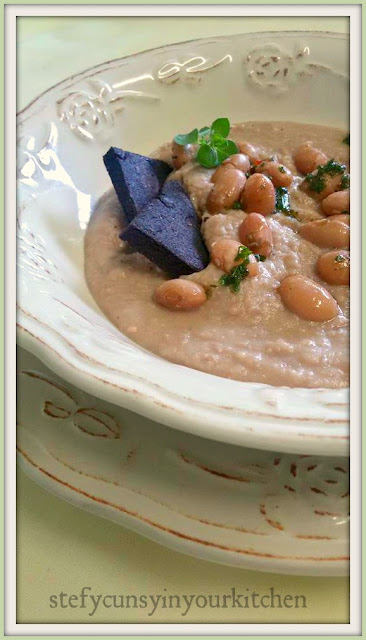 Vellutata di fagioli aquilani all’olio aromatico piccante con cialde di riso venere.